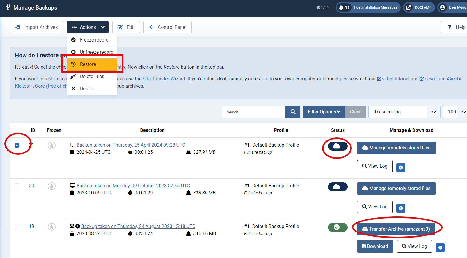 Para recuperar de una copia de Akeeba Backup (punto 2), se puede hacer desde la misma aplicacion, seleccionando archivo y recuperar